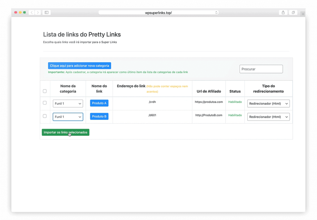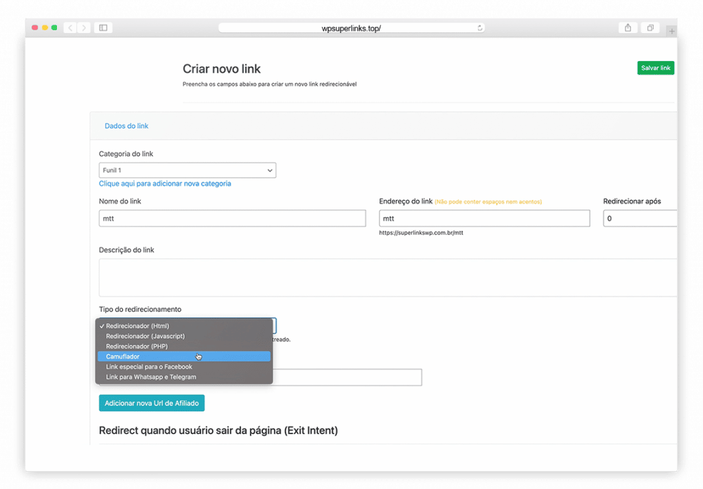 O Super Links permite que você crie links usando seu próprio domínio que redirecionam para seus links de afiliado de forma camuflada ou não.