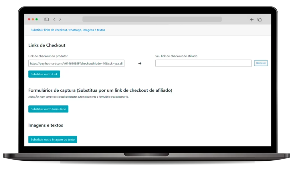 Apresentando uma inovação: a detecção automática de links de checkout, criada para tornar as substituições em páginas de vendas mais rápidas e simples.