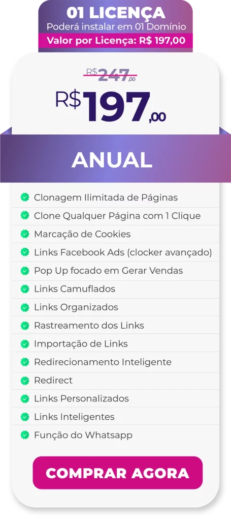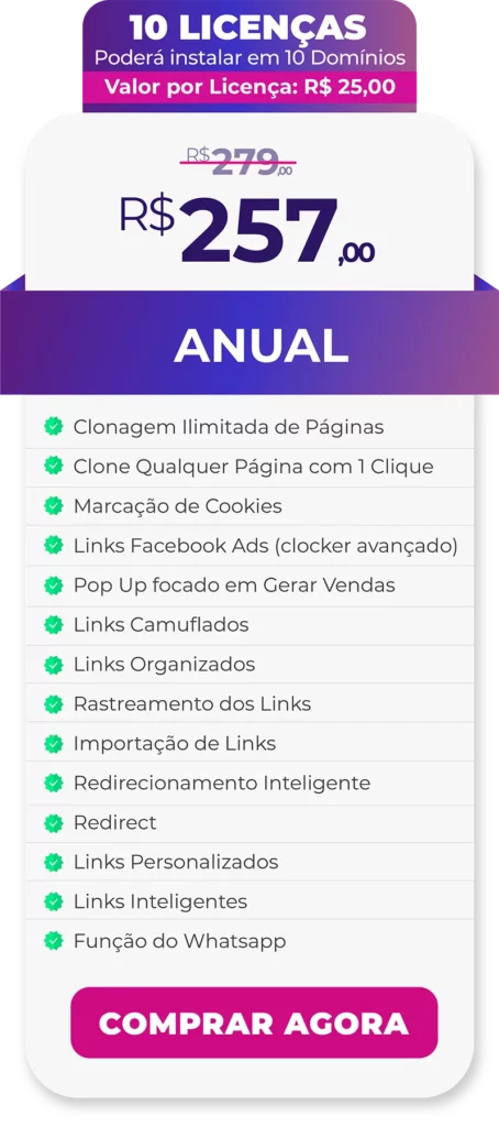 No Super Links você encontra as Melhores Funções que existe para Afiliados. VENDA MAIS, seja com Páginas Clonadas, Anúncios no Facebook Ads ou Artigos Em Blog. O Plugin Super Links foi pensado, estruturado e planejado para que você consiga Duplicar, Triplicar ou Quadruplicar as suas Vendas… Cada função foi cuidadosamente planejada para te ajudar a Aumentar as suas Vendas, é por isso que o Super Links é hoje uma Ferramenta Obrigatória para qualquer Afiliado que quer ter Resultados na Internet.
